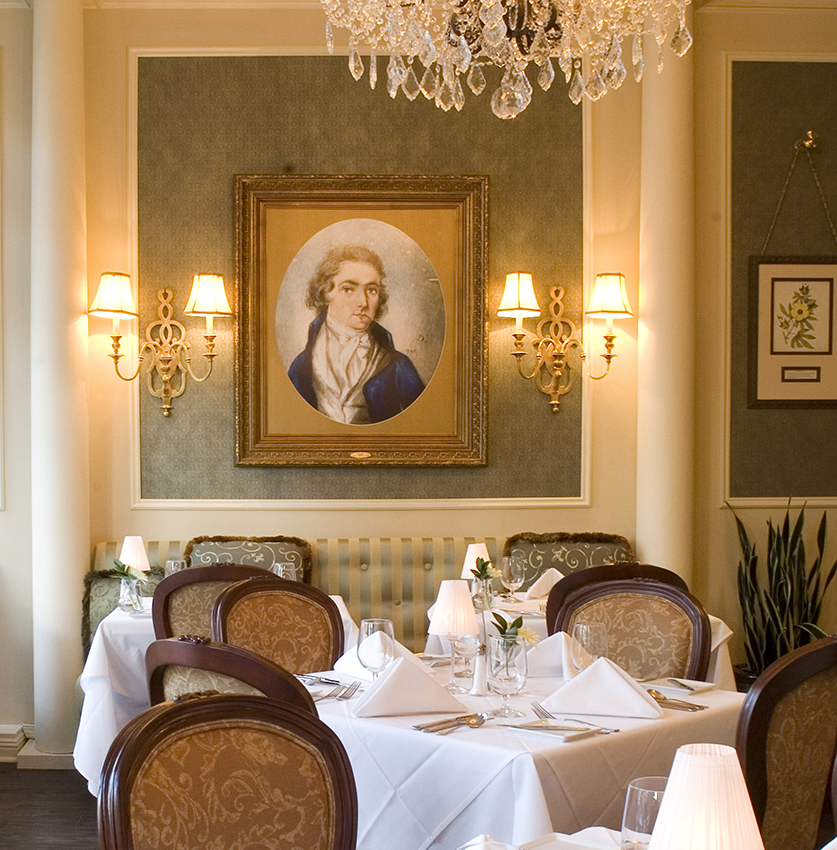 The restaurant and adjoining parlor room reflects the history of the original building owner, Samuel Prioleau, and usage of the building during the days it functioned as a warehouse; importing and exporting goods such as rice, tea and indigo. The atmosphere tirelessly tells of the Inns relevance in the history of Charleston, communicating a persona in which guests are able to relate, understand, partake in, remember and associate. Artwork portrays images of exported botanicals and replications of original ledgers used to record the traded goods, as well as, currency and maps from 1888. Portraits of the family hung on the walls give meaning to nearby street names which are immediately identified and connected back to the Inn when guests venture outside the property. The historic fireplace, now revitalized, and the restaurants entrance both feature custom ironwork similar to the ironwork at the entry awning; providing another opportunity to tastefully reinforce the Inn’s logo through its visual elements.