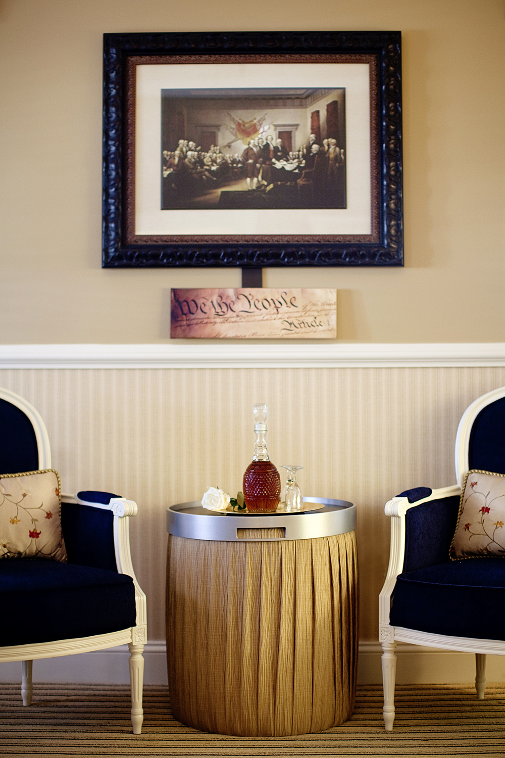 The graceful entryway that has been designed for the Inn welcome the guest into an open inviting lobby sprinkled with 18th century French pieces and artwork depicting the site of the Vendue Inn throughout history, silently showcasing its journey. The lobby’s visual presentation introduces the Inn to its guests in such a way that customers are able to understand the quality, characteristics, and value of this place they will call home for the next few nights.